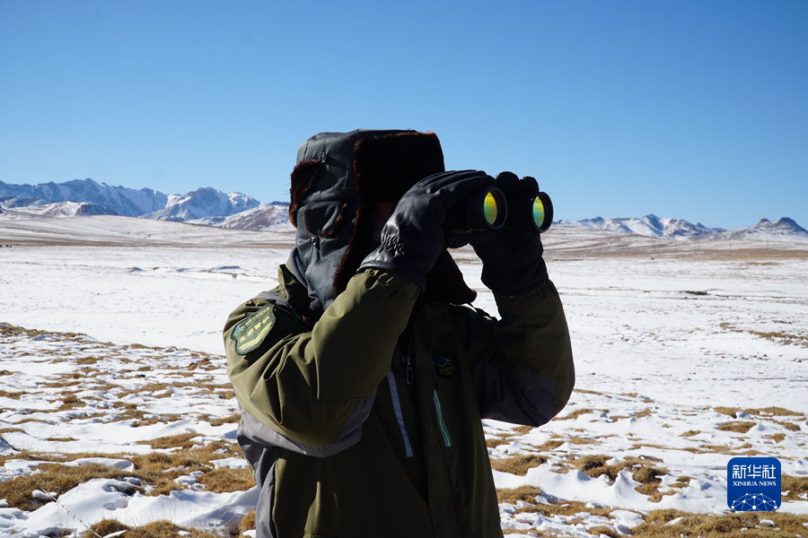12月3日,祁連山國家公園沙龍灘管護(hù)站生態(tài)管護(hù)員楊有財(cái)用望遠(yuǎn)鏡觀測。新華社記者 耿輝凰 攝