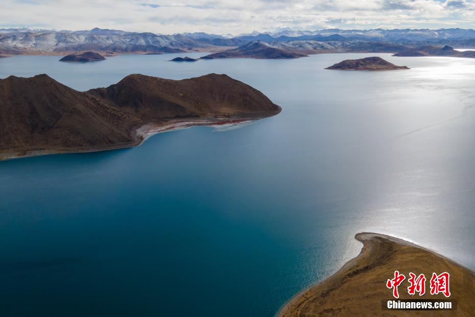 航拍羊卓雍錯(cuò)與遠(yuǎn)處的雪山。 江飛波 攝