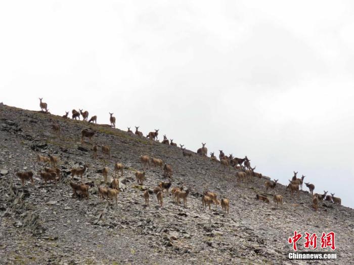 資料圖:隨著生態(tài)保護力度加強,當(dāng)?shù)厣鷳B(tài)管護員不斷拍攝到大量野生動物照片。圖為一群野生動物。曲麻萊管理處 供圖