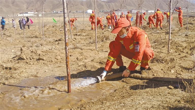 植樹造林不僅防止水土流失、調(diào)節(jié)氣候,同時也可以豐富生態(tài)資源,促進(jìn)經(jīng)濟(jì)發(fā)展等作用,是一項利于當(dāng)代、造福子孫的宏偉工程。春回大地萬物蘇,植樹添綠正當(dāng)時。活動現(xiàn)場消防救援人員精神飽滿、在大隊長王治平的帶領(lǐng)下所有消防救援人員鼓足了干勁,大家相互結(jié)伴,揮動著鐵鍬和鋤頭,挖坑、栽樹、覆土、澆水、齊心協(xié)力、配合默契,認(rèn)真細(xì)致地完成每一道工序,整個植樹活動現(xiàn)場到處都是忙碌的身影?!翱油谏钜稽c,這樣樹木才容易植活”,經(jīng)驗豐富的二級消防士洛桑頓珠一旁耐心指導(dǎo)他的隊友?!皠幼髀槔麅狐c,不然完不成我們班今天的任務(wù)了”,該大隊四班班長杜鵬給他的班級人員做動員?!敖衲晔俏伊x務(wù)植樹第8年。近年來,我們?nèi)湛t的綠化發(fā)展變化很大,作為土生土長的日喀則人,我們要種好每一顆樹,愛護(hù)好每一棵樹苗,為日喀則綠化增添綠。”該大隊分隊長嘎瑪赤烈說道。