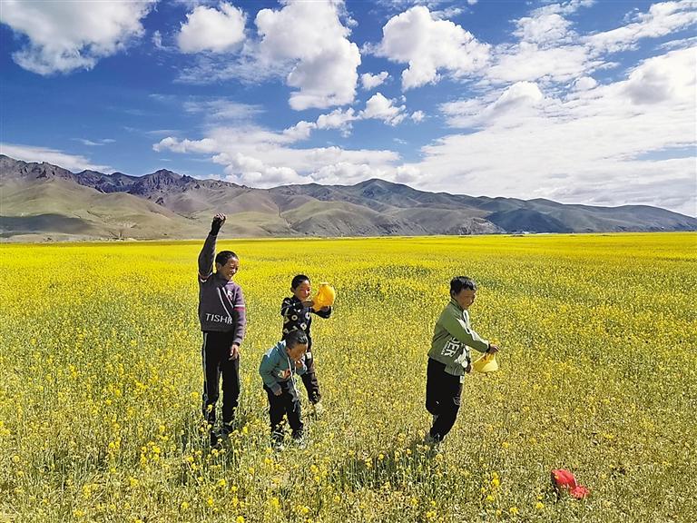 在那曲市色尼區(qū)羅瑪鎮(zhèn)凱瑪村,有一片由油菜花和披堿草共同構(gòu)成的草場(chǎng)。盛夏時(shí)節(jié),七千畝的油菜花競(jìng)相盛開(kāi),成為碧綠羌塘草原上一片金燦燦的風(fēng)景。