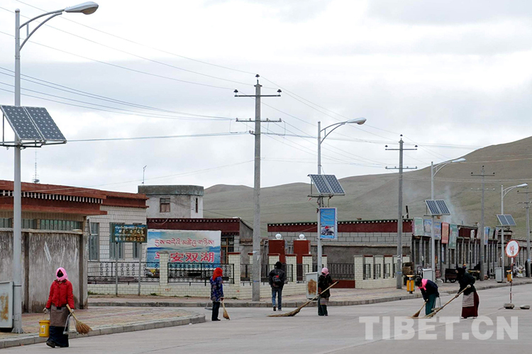當時,經過創(chuàng)業(yè)者三十多年的開發(fā)建設,雙湖鎮(zhèn)中心已有了一條筆直寬敞的水泥路,道路兩旁還有漂亮的太陽能路燈和垃圾箱,黨政辦公樓、敬老院、職工活動中心、幼兒園、普若崗日賓館、加油站等新建筑拔地而起,并建起了大型的太陽能光伏電站。
