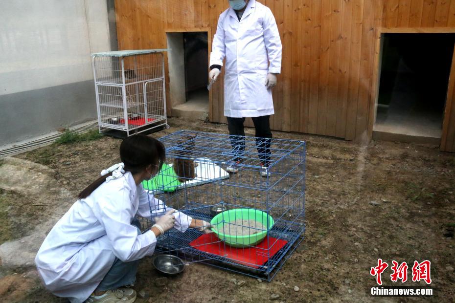 圖為“奶爸”“奶媽”給國家一級重點保護野生動物荒漠貓換貓砂。 張?zhí)砀?攝