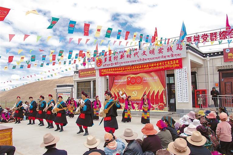 2021年7月2日,西藏自治區(qū)薩迦縣多夏村村民在新時代文明實踐站參加慶祝中國共產(chǎn)黨成立100周年和西藏和平解放70周年活動。