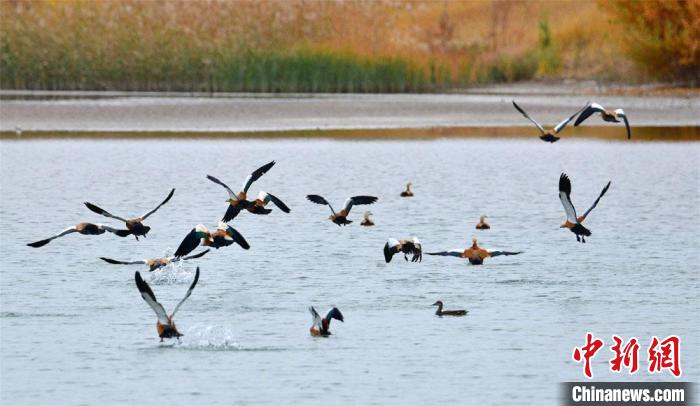 圖為10月底,甘肅敦煌黨河濕地成群野生鳥類翩翩飛舞。 王斌銀 攝
