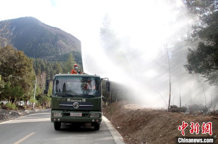 消防隊員進(jìn)行灑水增濕作業(yè)。 王澤棟 攝