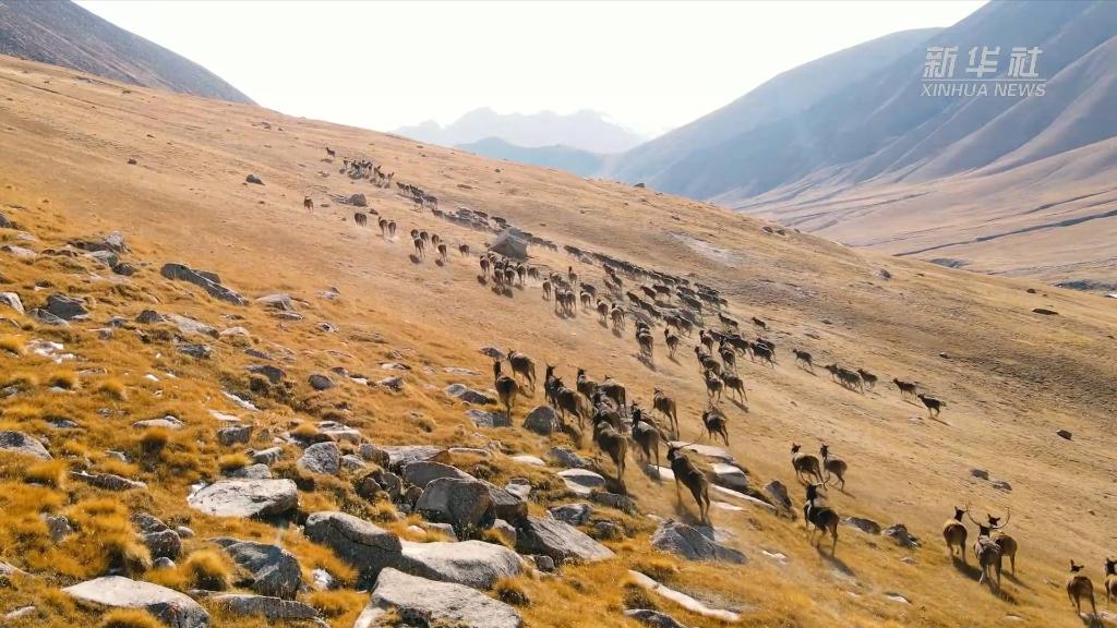 青海海西:上百只白唇鹿現(xiàn)身柏樹山
