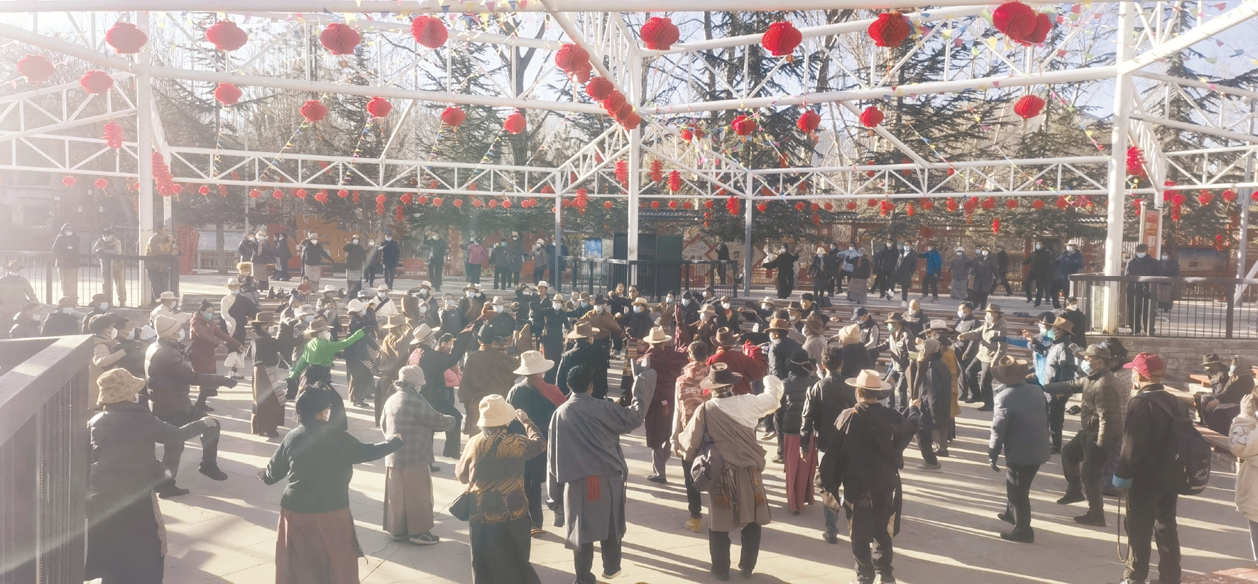 宗角祿康公園是市民群眾戶外活動的重要場所,近年來,為豐富群眾精神文化生活,拉薩市大力倡導全民健身,不斷完善公園健身器材,這里已成為市民每天進行晨練和休閑的首選之地。一大早,記者來到該公園看到,藏歷新年臨近,公園內到處掛起了紅紅火火的燈籠,讓公園換上了“新裝”,在陽光的照射下,鮮艷奪目,喜氣洋洋,與公園風景交相輝映,形成一道道靚麗的風景線。市民們不約而同地來到這里開展健身操、鍋莊、現(xiàn)代舞等健身活動。