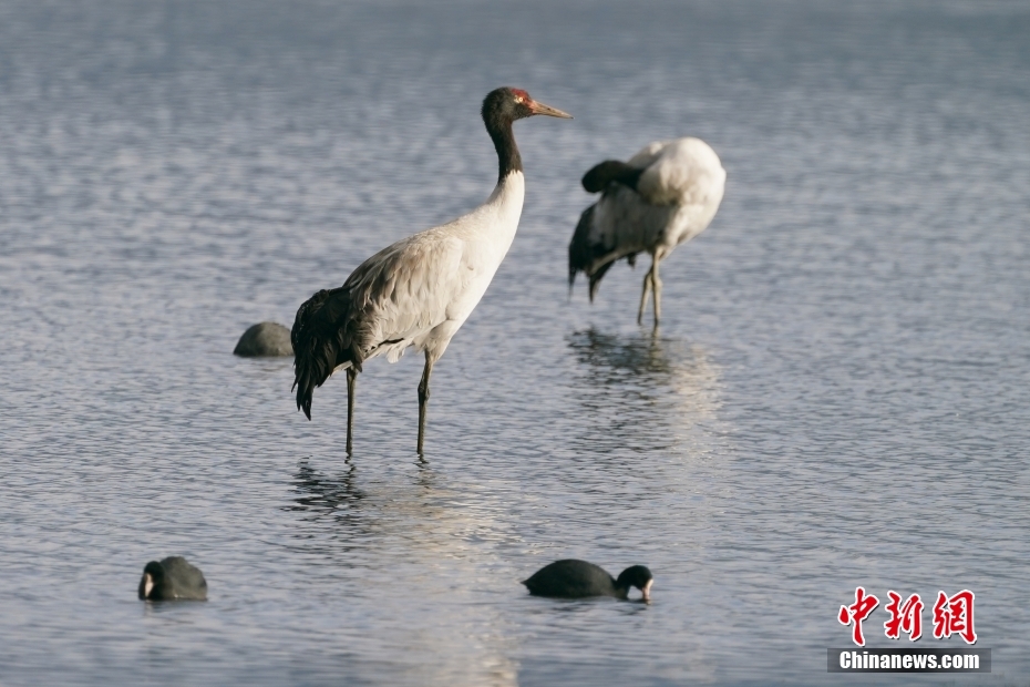 2月21日,黑頸鶴在納帕海岸邊覓食。中新社記者 劉冉陽 攝