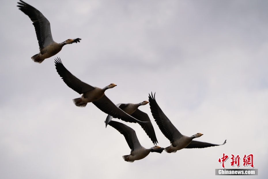 2月21日,納帕海上空展翅高飛的斑頭雁。中新社記者 劉冉陽 攝