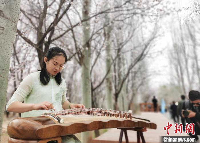 來自青海西寧的古力在杏花林撫琴,“我特意來到這邊,在杏花林彈古箏,畫面很美?;ㄩg彈琴本身是一種享受,希望也能感染踏青賞花的游客?!?/p>