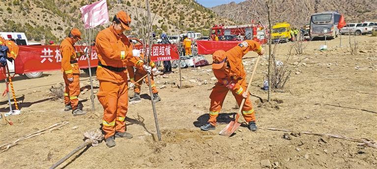 圖為消防指戰(zhàn)員義務(wù)植樹現(xiàn)場。 記者 彭琦 攝
