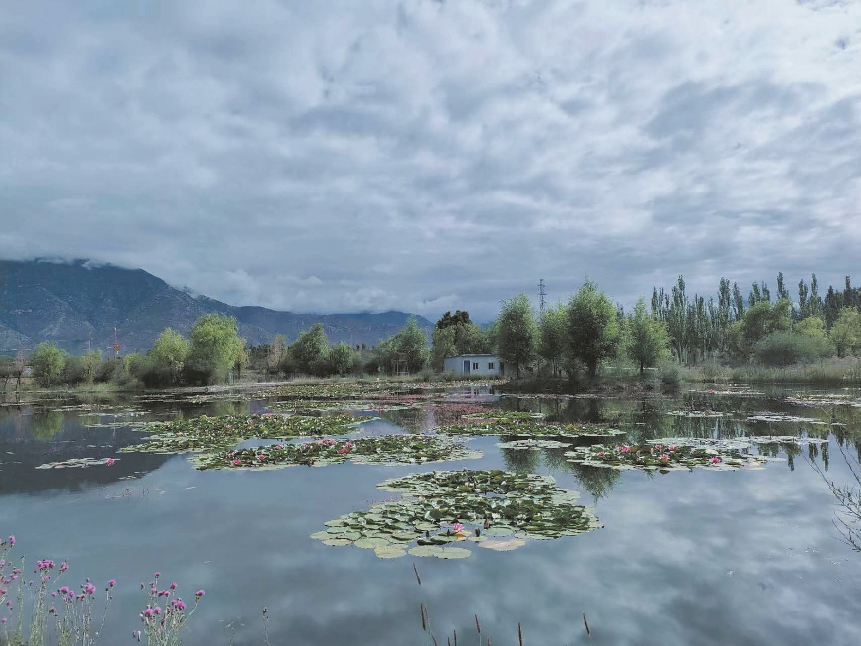 經(jīng)過反復試驗,王興邦從全國各地引進的蓮花種苗逐漸適應(yīng)高原環(huán)境,從盆里移栽到池塘后,成活率達到90%以上。2019年,在拉薩高新區(qū)管委會的支持下,王興邦又獨自一人到拉薩高新區(qū)濕地公園內(nèi)種植蓮花。據(jù)王興邦回憶,那時的濕地公園僅是一片兩三百畝地的灘涂地,環(huán)境臟亂差,無人管理。夏季漲水后,形成高低不平的洼地,冬季來臨,土壤裸露。
