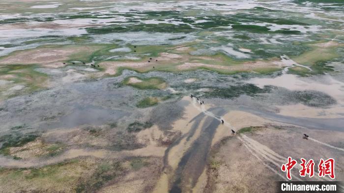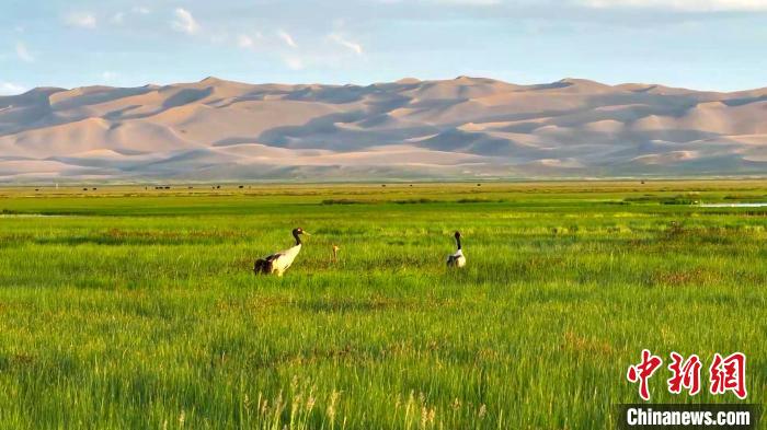 空中俯瞰阿爾金山國家級自然保護(hù)區(qū),芳草萋萋的依協(xié)克帕提濕地上,優(yōu)雅靈動(dòng)的黑頸鶴夫婦正在教授新出生的黑頸鶴寶寶學(xué)習(xí)捕食的技巧;鶴群的不遠(yuǎn)處,藏原羚一邊享受著多汁的青草,一邊好奇地打量著周圍的環(huán)境。