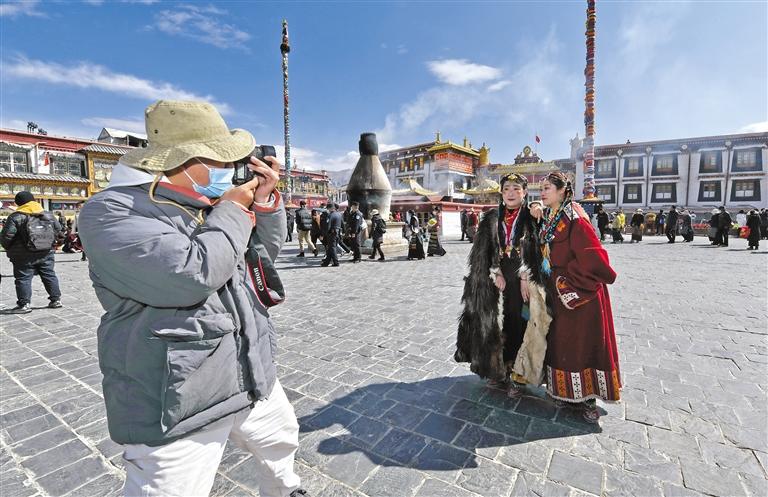 游客在大昭寺廣場(chǎng)拍照留念。記者 唐斌 攝