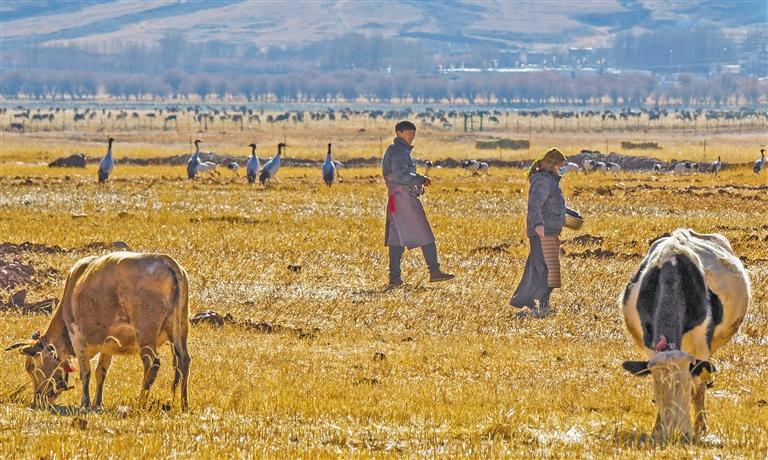 卡孜濕地是其中一個投食點?,F(xiàn)年43歲的洛桑次旦就住在附近,每天一大早,他都會到卡孜濕地放牧?!啊従印絹碓蕉嗔?,十幾年的時間,黑頸鶴的數(shù)量從幾只增長到幾百只。”洛桑次旦告訴記者,黑頸鶴和牛各吃各的,互不干擾,非常和諧。