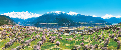 三四月間,漫山遍野的桃花開了,白的花、粉的花、紅的花,或是沿著山谷向幽深處蔓延,或是向開闊處鋪展……再遠(yuǎn)處,是白雪皚皚的山峰,映著湛藍(lán)的天,色彩明朗如畫。
