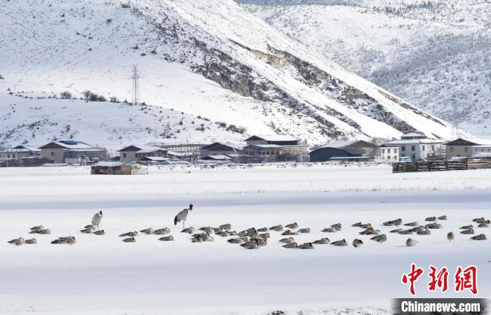 圖為12月14日,納帕海雪地中的黑頸鶴、斑頭雁等越冬鳥。陳志明 攝
