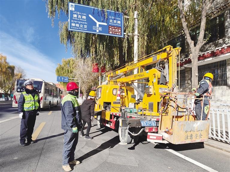 園林工人修剪遮擋路燈、監(jiān)控探頭的枝葉。圖由拉薩城關區(qū)潔達園林綠化投資工程有限公司提供
