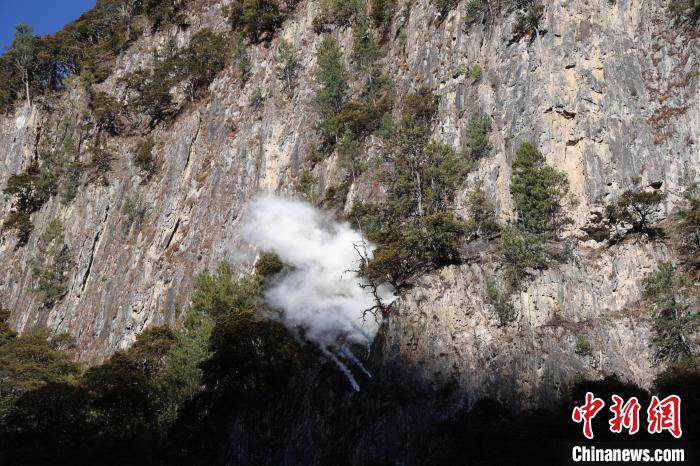圖為演練現(xiàn)場(chǎng),無(wú)人機(jī)投彈撲打懸崖火。王澤棟 攝