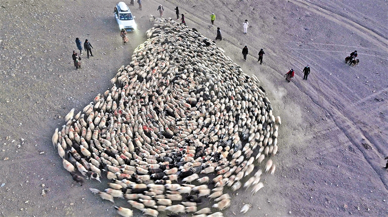 隨著趕羊進度加快,“一”字形的羊群隊伍逐漸拉長。浩浩蕩蕩的羊群用它們的身姿勾勒出一條緩緩移動的金線,為這片蔚藍透亮的冰湖增添了生命的靈動。