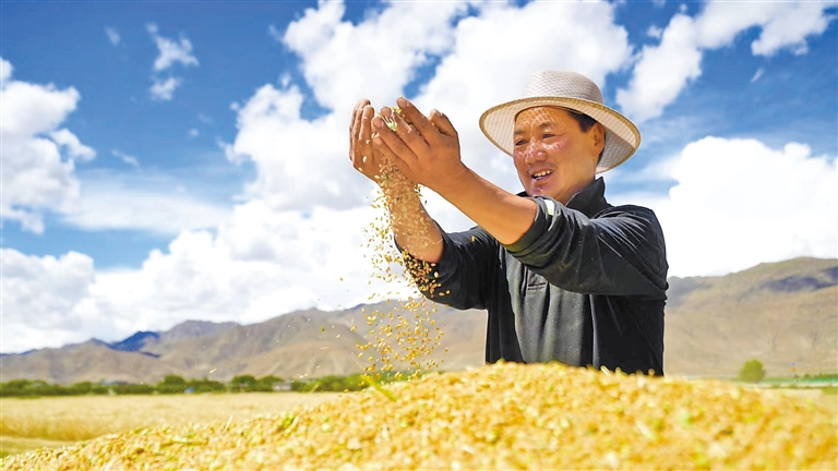 日喀則市白朗縣嘎東鎮(zhèn)馬義村村委會副主任普瓊手捧豐收的麥粒,高興地說:“高標準農(nóng)田建設(shè)為我們節(jié)省了大量的人力,實現(xiàn)了農(nóng)業(yè)機械化,讓未來的生活充滿了希望。”
