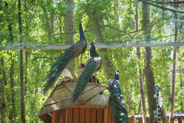 乘著觀光車前行,一路都被綠葉青草圍繞。觀賞完動物,記者一行在動物園內(nèi)的餐廳就餐,等待美食的過程中,點(diǎn)一杯咖啡或甜茶,看著藍(lán)天白云和滿眼綠意,不時還能聽到孔雀啼鳴,別有一番滋味。