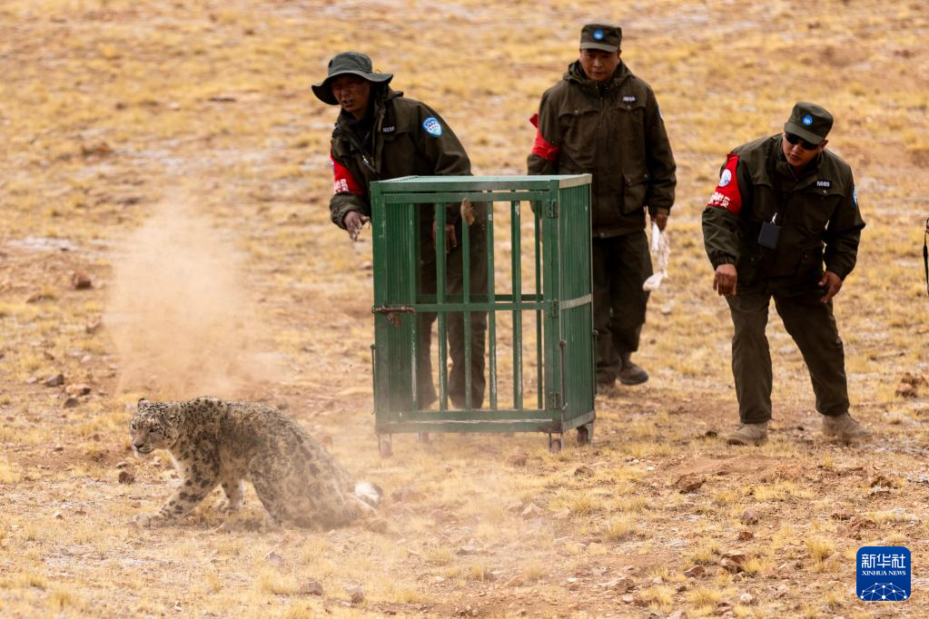 5月7日,尼瑪縣野生動(dòng)物管護(hù)隊(duì)工作人員在羌塘國(guó)家級(jí)自然保護(hù)區(qū)核心區(qū)將雪豹放歸自然。新華社記者 姜帆 攝??