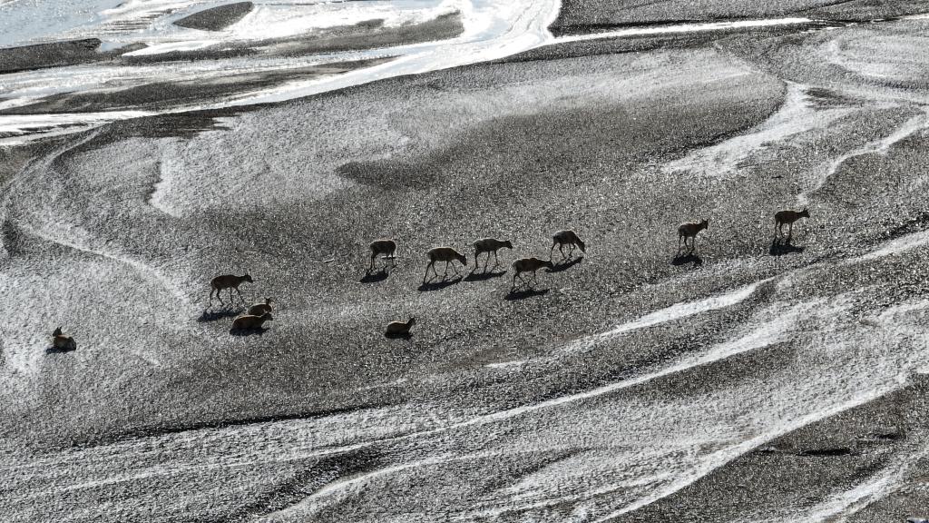 在甜水河畔荒灘雪地中向產(chǎn)羔地遷徙的藏羚羊(6月15日攝)。