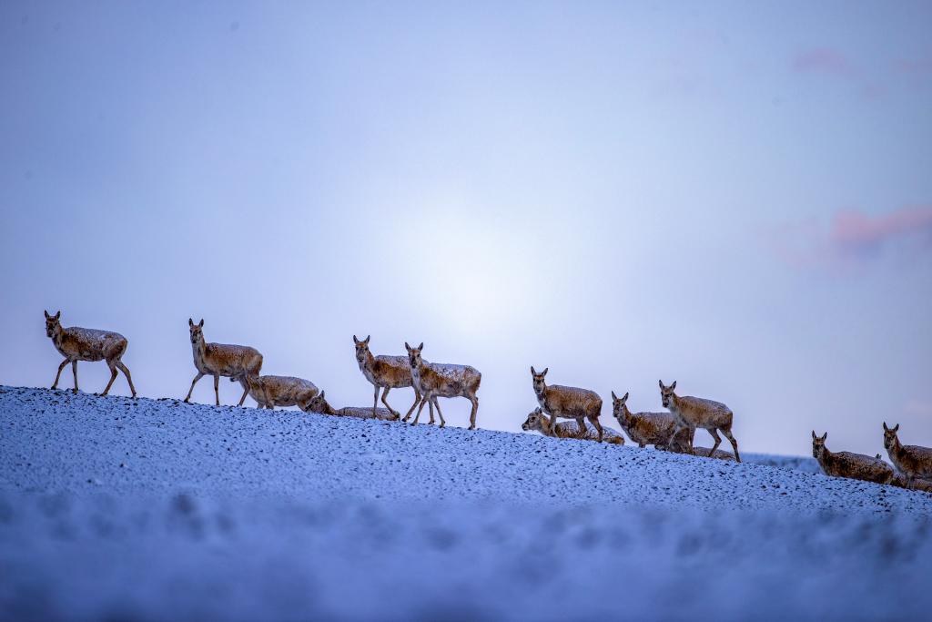 6月15日清晨雪后,在羌塘國家級自然保護區(qū),迎著朝霞前行在遷徙路上的一群藏羚羊。