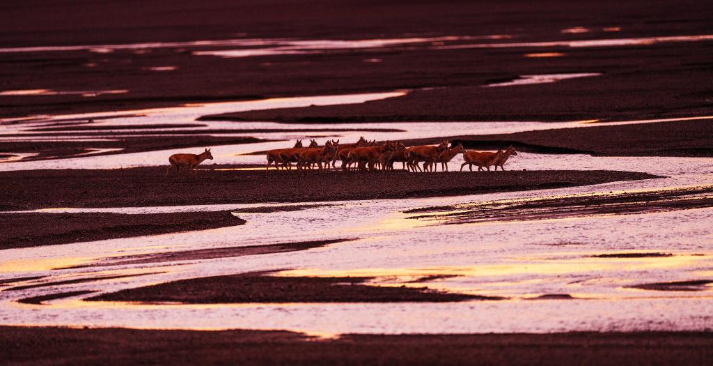 6月13日傍晚,在羌塘國家級自然保護區(qū),遷徙中的母藏羚羊越過甜水河。