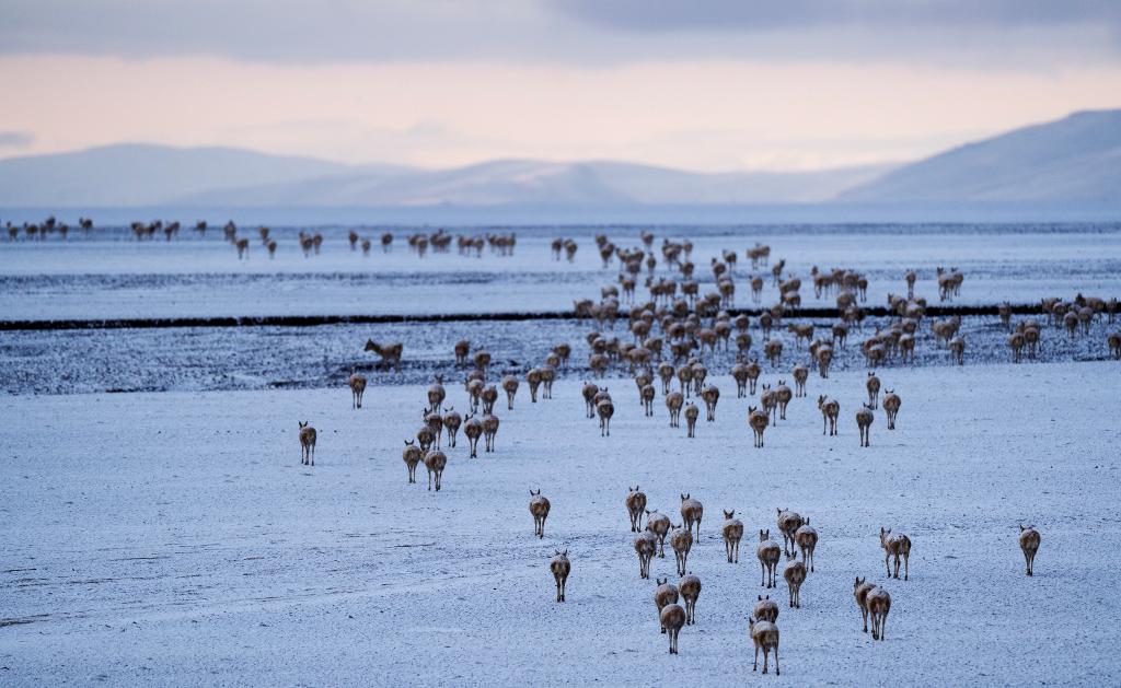 大群遷徙的藏羚羊途徑甜水河畔的荒灘雪地,向產(chǎn)羔地遷徙(6月15日攝)。