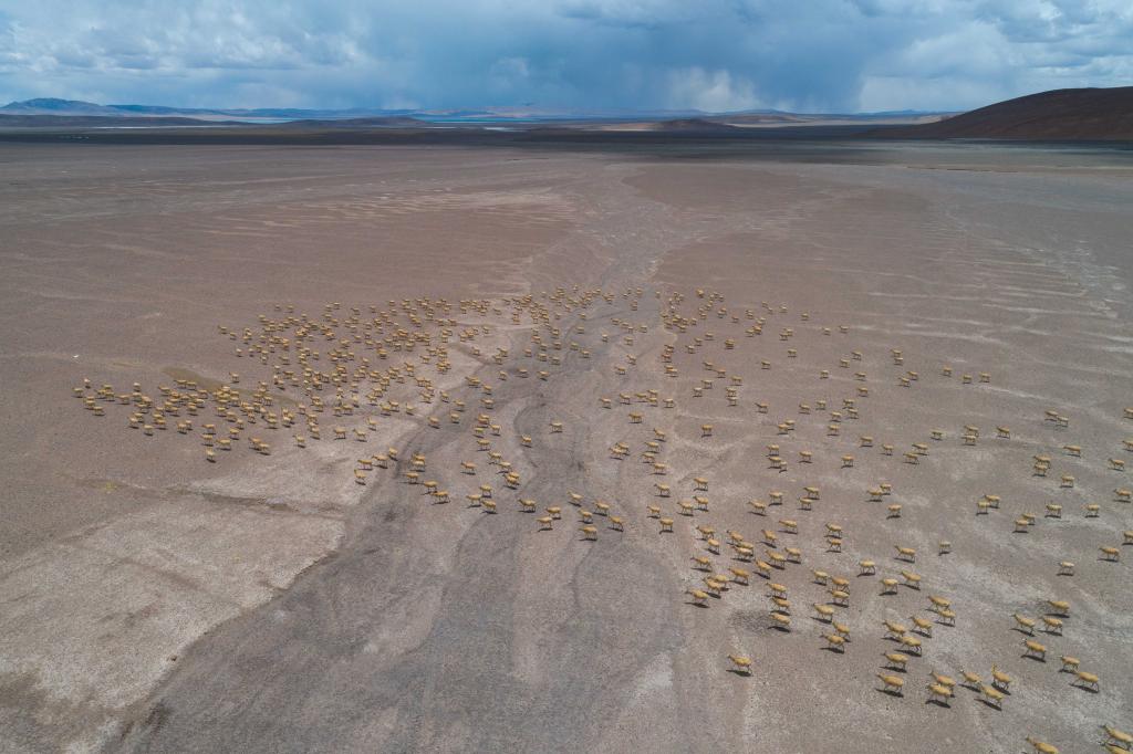 大群遷徙的藏羚羊在甜水河畔的荒灘上向產(chǎn)羔地遷徙(6月14日攝)。