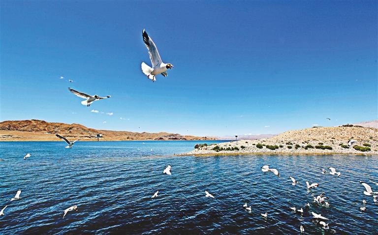 “現(xiàn)在的拉薩河更像一個湖,湖寬水深、濤聲陣陣,金色的陽光灑滿湖面,一陣風吹來,掀起了不少漣漪。成群結(jié)隊的候鳥在湖面自由自在地翱翔、嬉戲,讓人心曠神怡?!卑頃r分,家住頓珠金融城的拉薩市民平措在拉薩河三號閘上悠閑散步、感慨地說道。