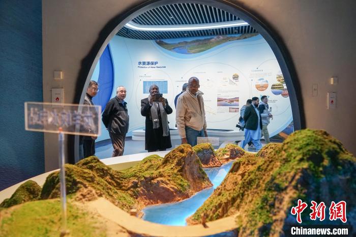 圖為代表團成員在青海省自然資源博物館內(nèi)通過模型了解青海省水資源。中新社記者 馬銘言 攝