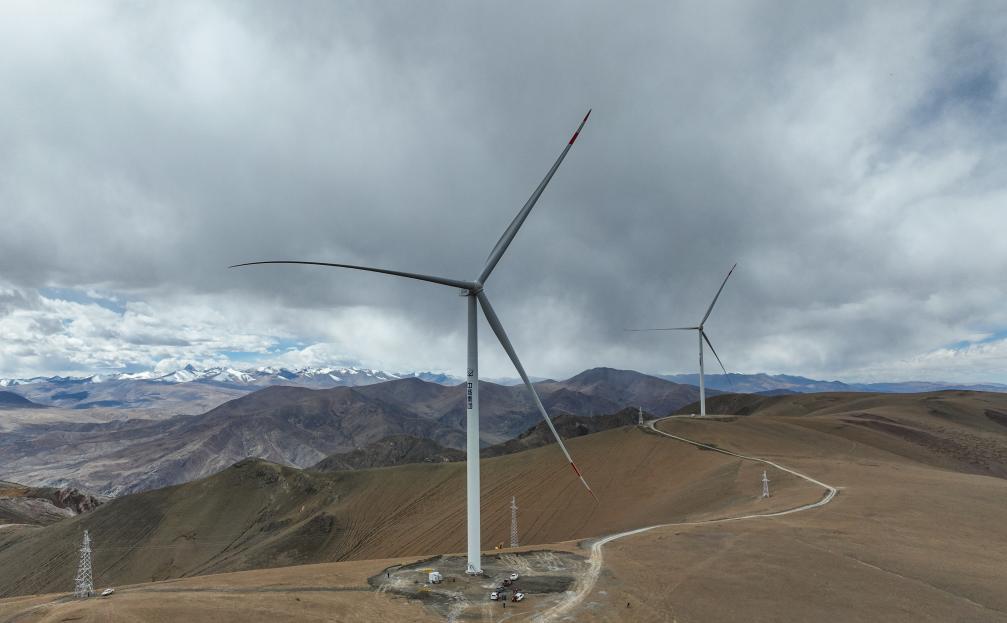 10月17日拍攝的位于西藏日喀則市薩迦縣的風(fēng)力發(fā)電機(jī)組(無(wú)人機(jī)照片)。新華社記者 晉美多吉 攝