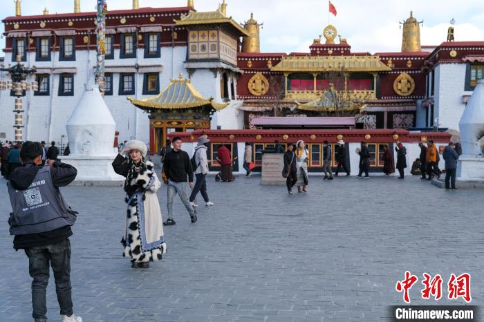 11月28日下午,游客在拉薩大昭寺廣場(chǎng)拍攝服裝寫真?!≈行律缬浾?江飛波 攝