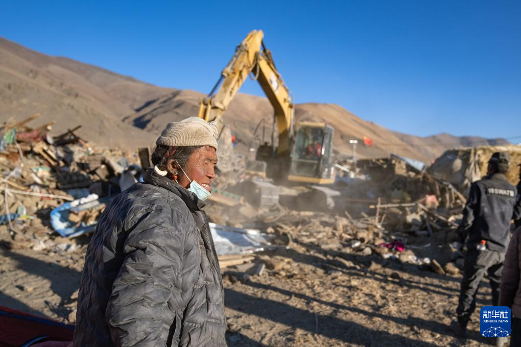 1月13日,在定日縣長(zhǎng)所鄉(xiāng)古榮村,邊巴桑珠在指揮房屋廢墟清理工作。新華社記者 丁增尼達(dá) 攝