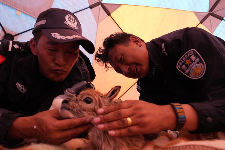 在索南達杰保護站,可可西里巡山隊隊員在給被救助的藏羚羊幼仔喂奶(2023年7月28日攝)。新華社記者 張宏祥 攝