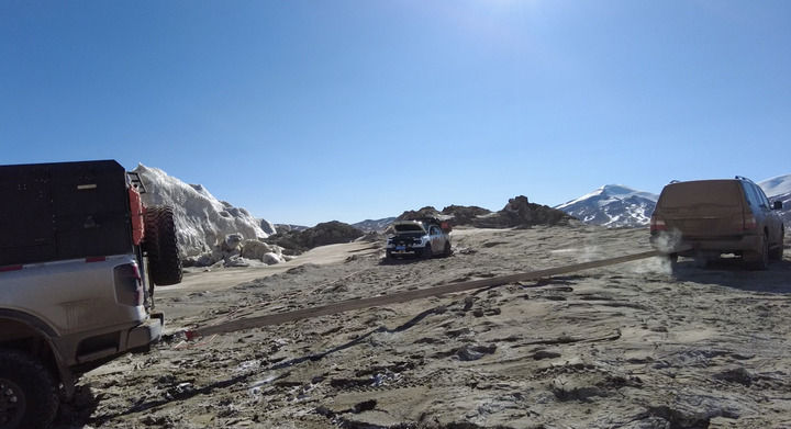 可可西里巡山隊隊員在巡山過程中用拖車繩拉出被困車輛(2025年1月14日攝)。新華社發(fā)(杜笑微攝)