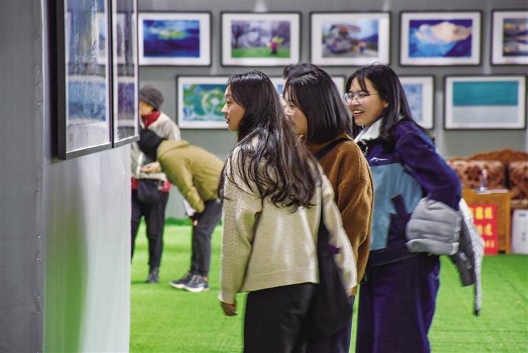 大學(xué)生在書畫展覽現(xiàn)場(chǎng)參觀。