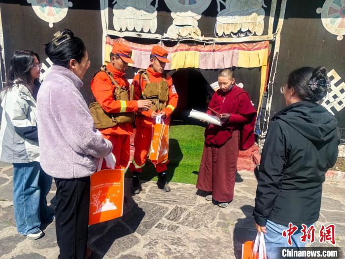 圖為西藏森林消防總隊隊員進寺廟發(fā)放防火宣傳手冊。王治平 攝