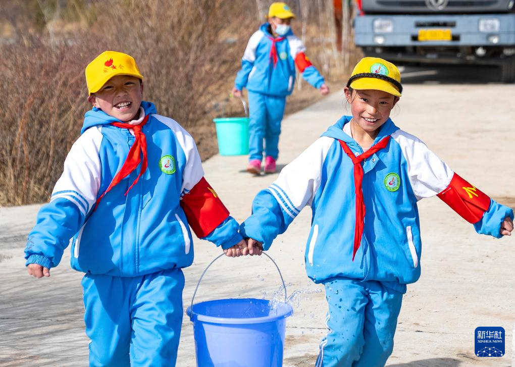 4月25日,幾名那曲市小學(xué)四年級學(xué)生在搬水準(zhǔn)備給樹苗澆水。新華社記者 丁增尼達 攝