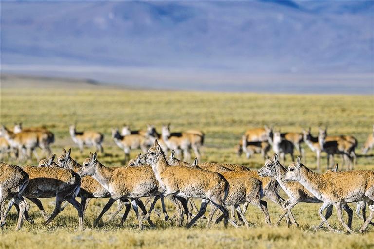 圖為在羌塘國(guó)家級(jí)自然保護(hù)區(qū)核心區(qū)拍攝到的雌性藏羚羊群(6月10日攝)。新華社記者 旦增尼瑪曲珠 攝