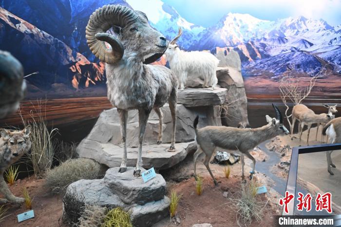 6月16日,在位于甘肅省張掖市肅南裕固族自治縣的祁連山國家公園自然博物館展陳的西藏盤羊標本。中新社記者 李亞龍 攝