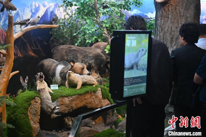 6月16日,在位于甘肅省張掖市肅南裕固族自治縣的祁連山國家公園自然博物館內(nèi),游人參觀喜馬拉雅旱獺標本。中新社記者 李亞龍 攝