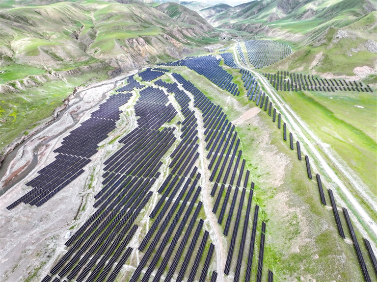 圖為索縣神話亞拉60兆瓦牧光互補(bǔ)儲(chǔ)能光伏發(fā)電項(xiàng)目現(xiàn)場(chǎng)(無(wú)人機(jī)照片)。記者 萬(wàn)靖 攝