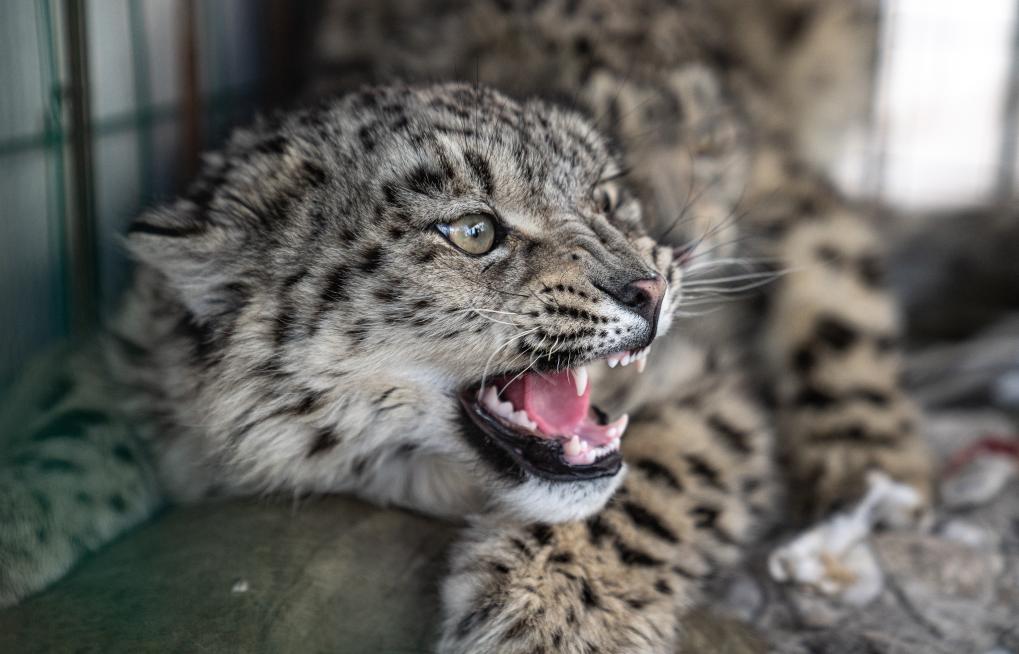 2024年5月13日,兩只雪豹在西藏自治區(qū)那曲市尼瑪縣被野生動物管護隊員放歸自然。這是放歸前拍攝的其中一只雪豹(2024年5月13日攝)。