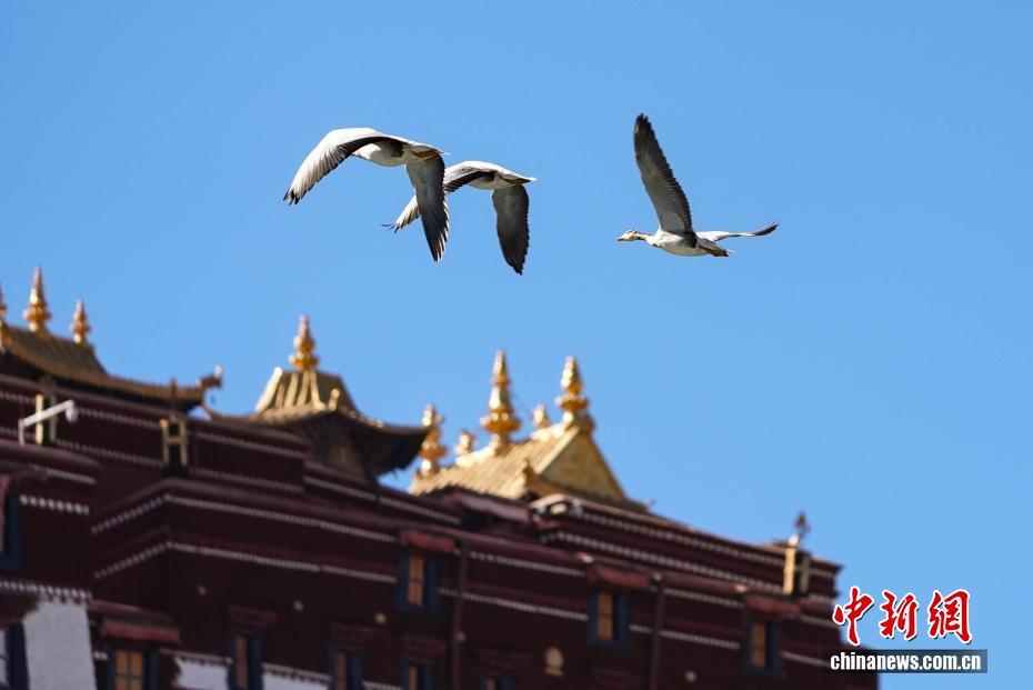 11月17日,西藏拉薩迎來大批越冬候鳥。拉薩河、宗角祿康公園等地,成為了它們的棲息天堂。在宗角祿康公園內(nèi),赤麻鴨、斑頭雁成群結(jié)隊,時而低頭覓食,時而水中嬉戲。它們的身影引得市民和游客紛紛駐足觀賞、拍照留念,構(gòu)成了一幅人與自然和諧共生的美麗畫卷。圖為斑頭雁與布達拉宮同框。
