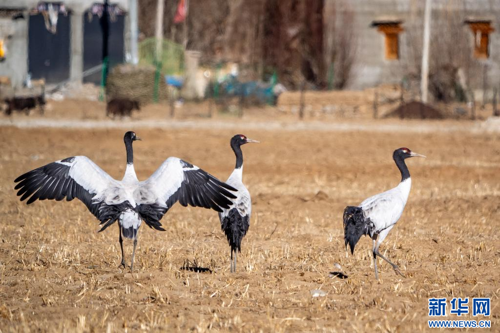 12月19日,在西藏日喀則市南木林縣的雅魯藏布江河畔田間拍攝的黑頸鶴。新華網(wǎng) 旦增努布 攝